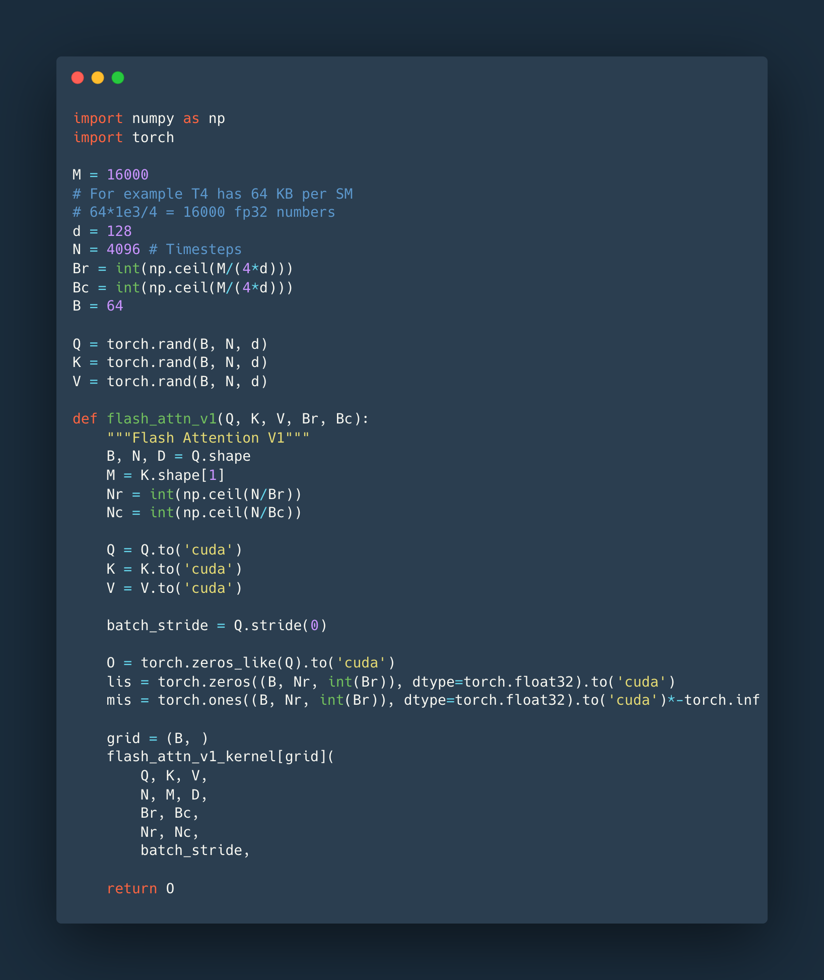 In the example above I was simply using Br = 2 and Bc = 2. But in the above code the initialization is based on the device capacity. I have included the calculation for a T4 GPU. For any other GPU, we need to get the SRAM capacity and adjust these numbers accordingly. Now for the actual kernel implementation: