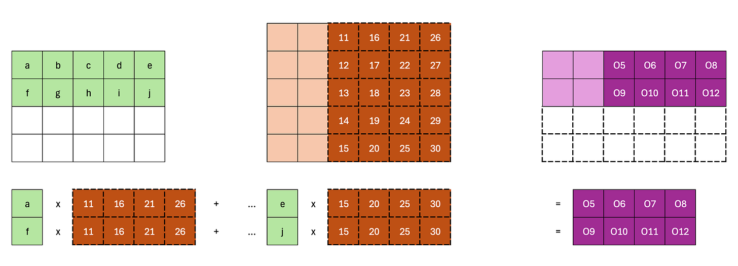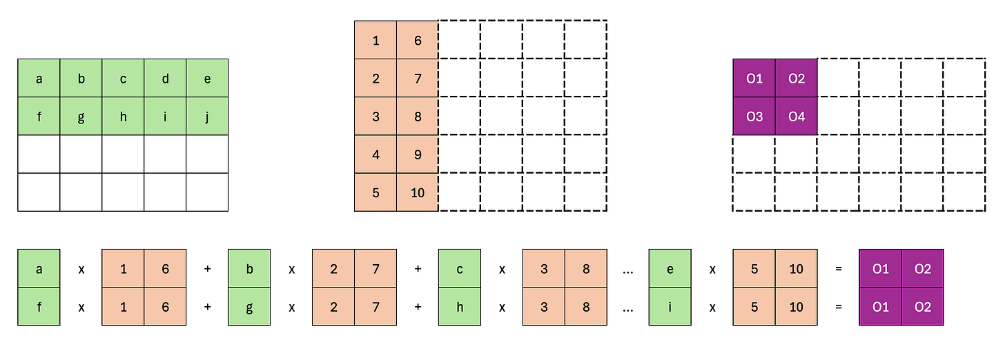 This shows a toy example of a blocked matrix multiplication except we have blocks only on the rows of A (green) and columns of B (Orange? Beige?). As you can see above the output O1, O2, O3 and O4 are complete (those positions need no more calculations). We just need to fill in the remaining columns in the initial rows by using the remaining columns of B. Like below: