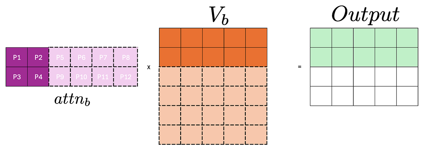 The last step in our attention computation is our dot product with V. To start we would have initialized a matrix full of 0’s in our HBM as our output of shape NxD. Where N is the number of Queries as above. We use the same block size for V as we had for K except we can apply it row wise like below (The subscripts just denote that this is only a block and not the full matrix)