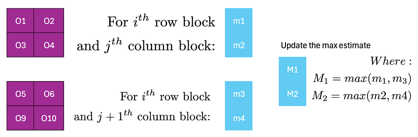 To understand the notation, wherever you see _ij implies thats the local values for a given block of columns and rows and _i implies its for the global output rows and Query blocks. The only part we haven’t explained so far is the final update to O_i. That’s where we use all the ideas from above to get the right scaling.